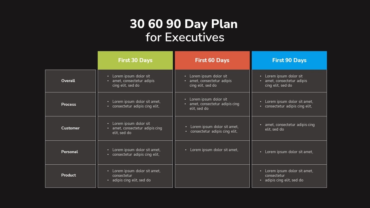 A typical 30/60/90 day plan template is divided into three sections, with specific goals and actions for each time frame. In the first 30 days, you may focus on getting to know your team, understanding your role, and setting short-term goals. The next 30 days are about building on your initial successes, developing relationships, and working towards mid-term objectives. Finally, the last 30 days are dedicated to achieving long-term goals, contributing to strategic initiatives, and preparing for the future.