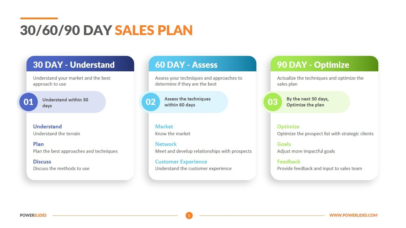 By the 90-day mark, the sales professional should have a solid understanding of their sales territory, established relationships with key clients, and be well on their way to meeting their sales targets. The final stage of the plan is about fine-tuning strategies, identifying areas for improvement, and setting new goals for the upcoming months.