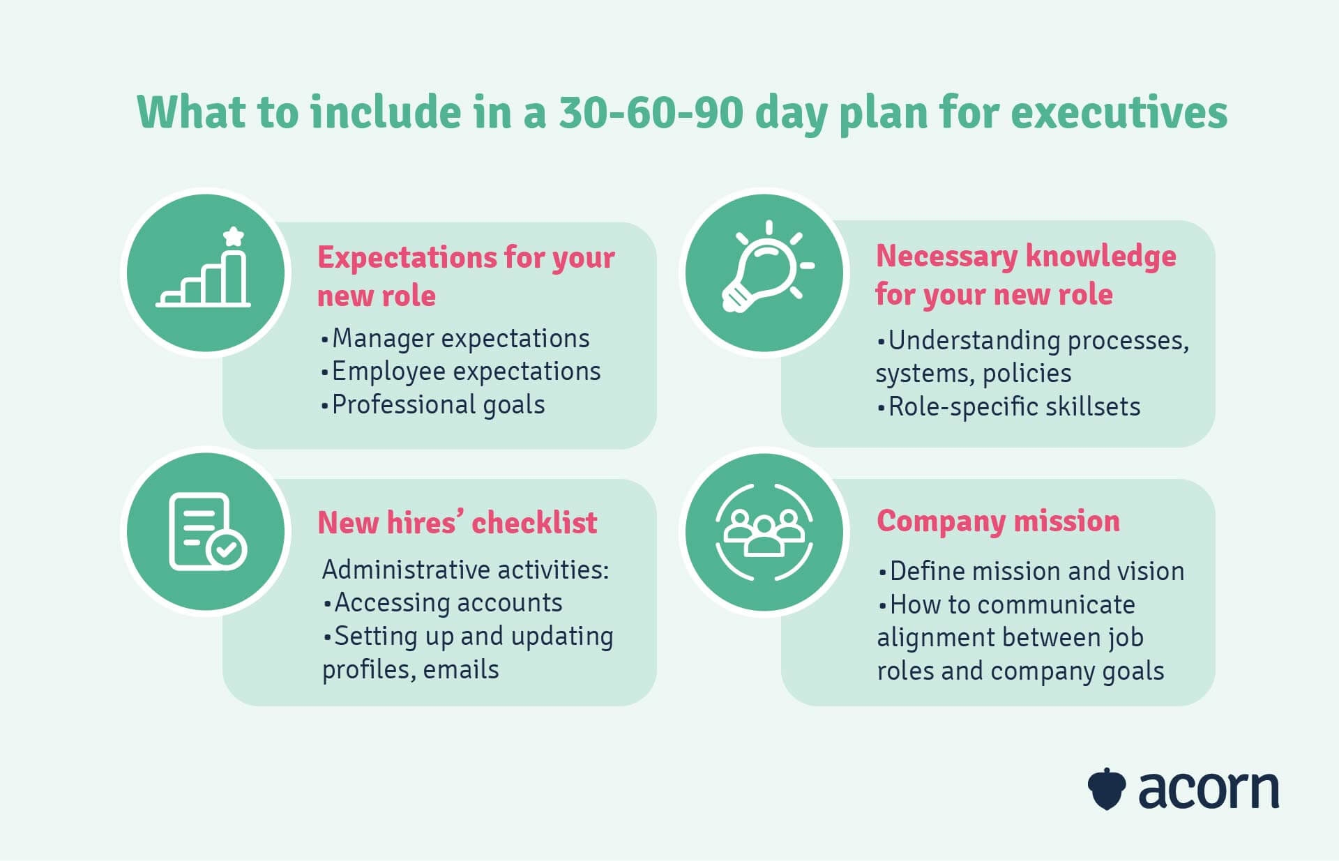 1. First 30 Days: In the first 30 days of your new role, focus on learning the ins and outs of the company, its culture, and your specific responsibilities. Set goals such as establishing relationships with your team members, understanding key processes, and identifying areas for improvement.