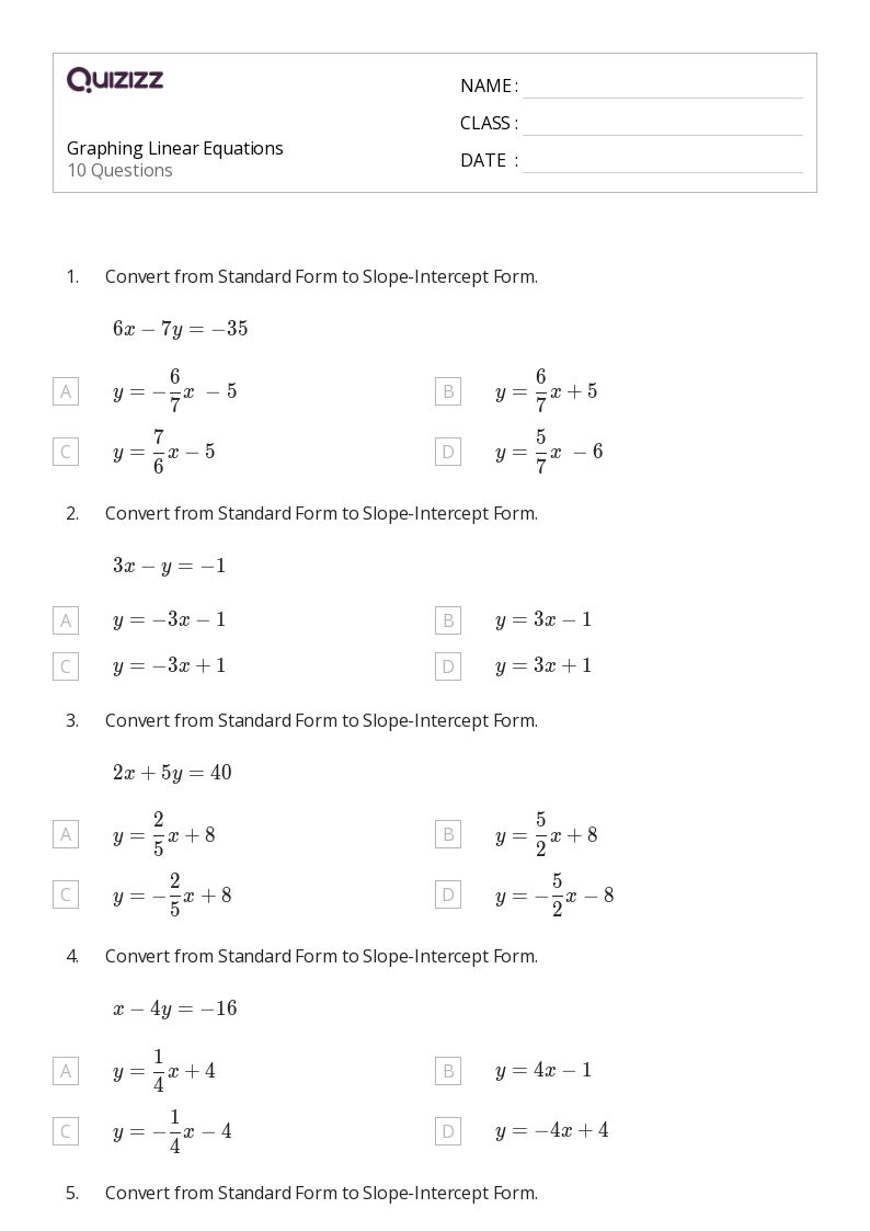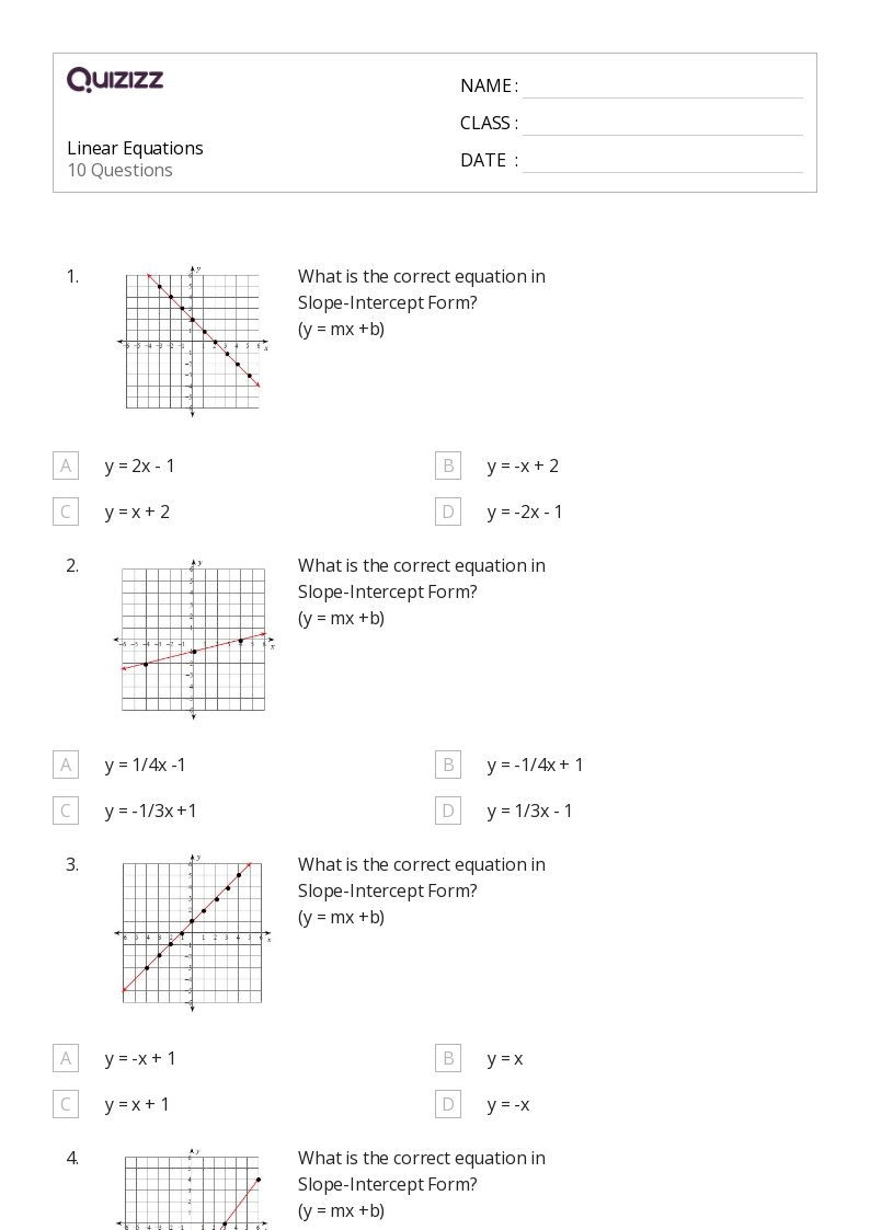 8th-grade linear equations worksheets may include problems such as solving for x in equations like 2x + 5 = 15 or finding the slope of a line given two points. These exercises help students develop problem-solving skills, critical thinking, and algebraic reasoning.