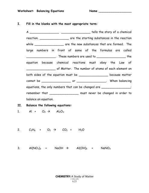 One common type of worksheet that students may encounter is a balance the equation worksheet. These worksheets typically contain a series of chemical equations that are unbalanced, and students are tasked with balancing them by adjusting the coefficients of the reactants and products. This process requires students to carefully track the number of atoms of each element on both sides of the equation and make adjustments as needed to ensure that the equation is balanced.