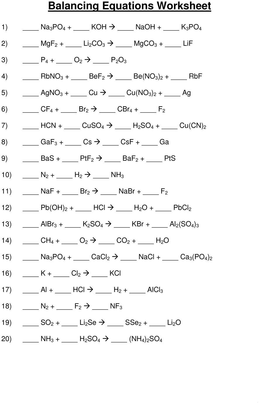 A balancing equations chemistry worksheet is a helpful tool that allows students to practice this skill. These worksheets typically present chemical equations that are unbalanced, and students must work through the process of balancing them. Having an answer key is crucial for students to check their work and understand where they may have made mistakes.