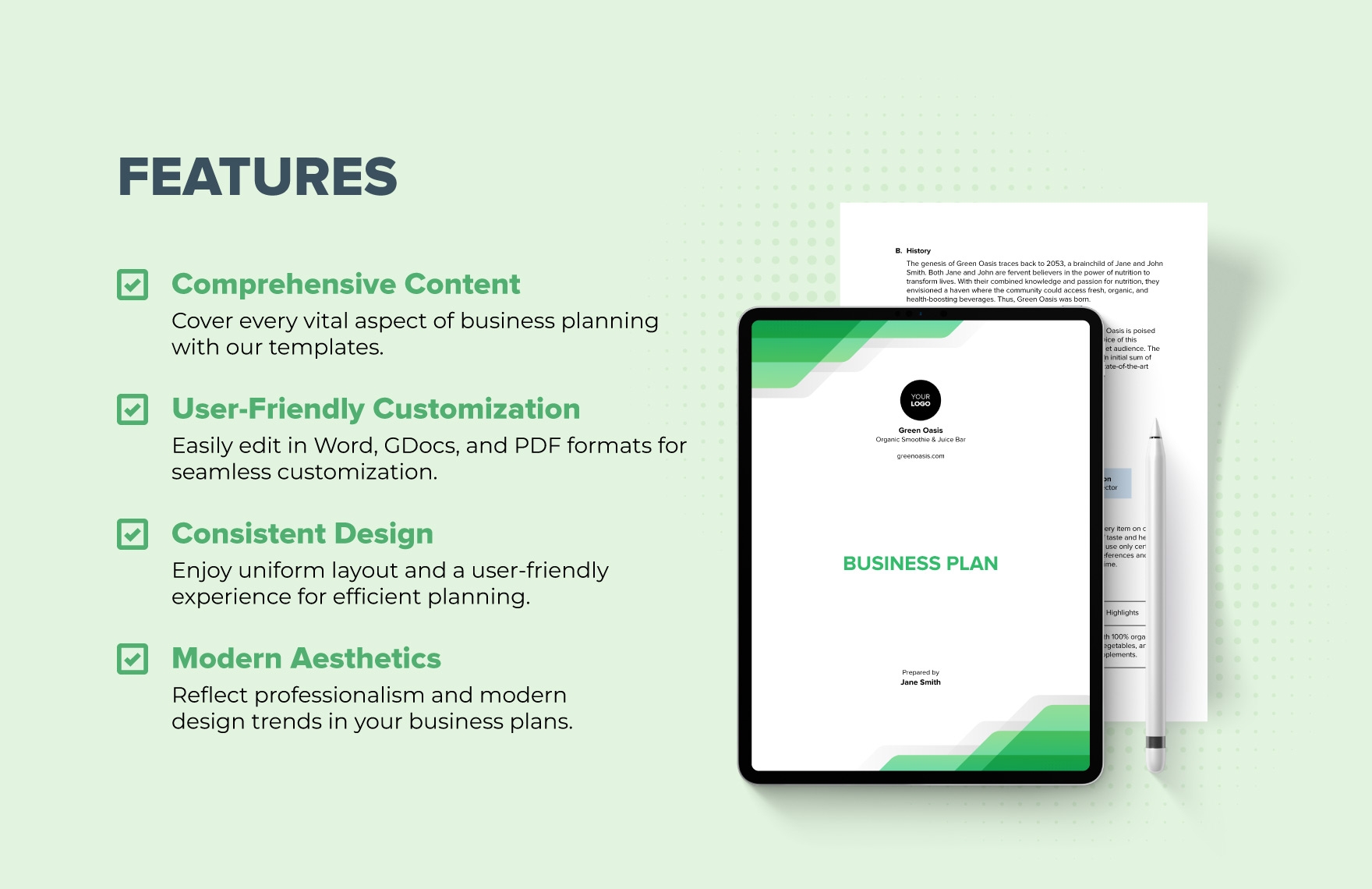 With a business plan template in Word format, you can quickly and easily create a professional-looking business plan without the need for specialized software or design skills. These templates typically include sections for outlining your business concept, market analysis, marketing strategy, and financial projections. By using a template, you can ensure that your business plan is comprehensive and well-organized, helping you to present a clear and coherent vision to potential investors or lenders.