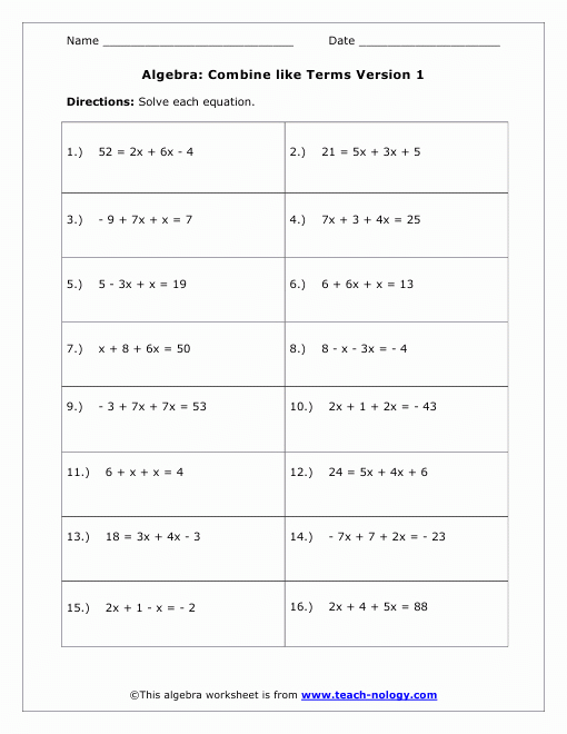 Benefits of Using Combining Like Terms Solving Equations Worksheets