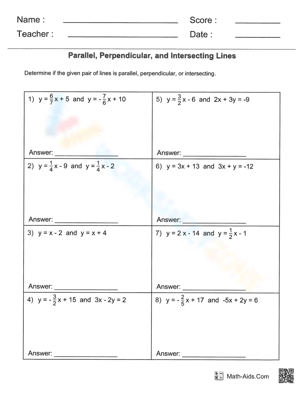 Free Printable Parallel Perpendicular Or Neither Worksheets