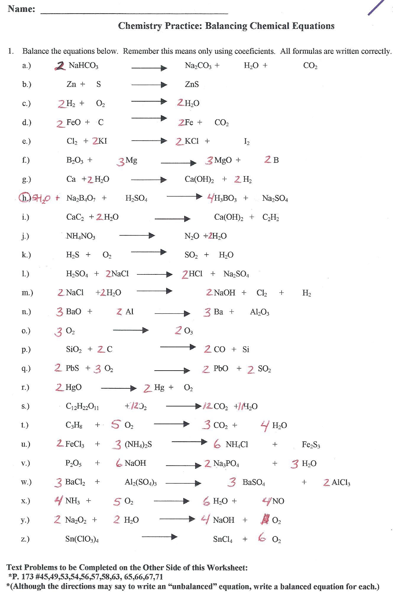 Equation balance worksheets are a helpful tool for students to practice balancing chemical equations in chemistry. These worksheets typically contain a series of chemical equations that students must balance by ensuring that the number of atoms of each element is the same on both sides of the equation. This skill is crucial in chemistry as it helps students understand the law of conservation of mass and how chemical reactions work.