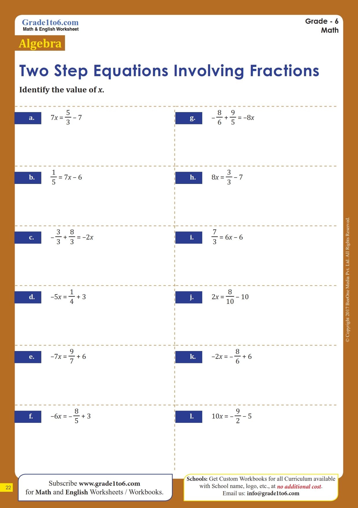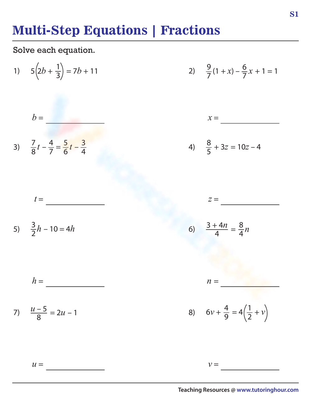 On this worksheet, students will encounter a variety of equations that involve fractions. Some problems may require students to find a common denominator before adding or subtracting fractions, while others may involve multiplying or dividing fractions. Students will also practice solving equations with variables that have fractions as coefficients or constants.