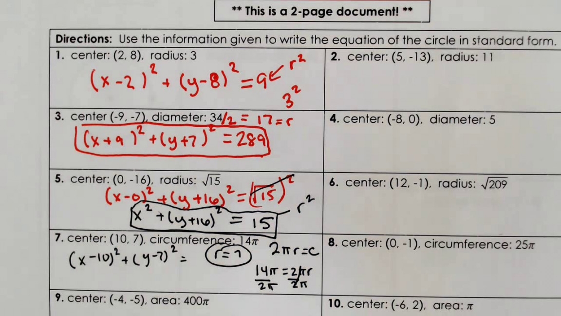 Understanding the equations of circles is an important concept in mathematics. Circles are a fundamental shape in geometry, and being able to work with their equations allows us to solve various problems related to circles. One way to practice and test your knowledge of equations of circles is through worksheets. These worksheets typically contain a series of questions that require you to identify the center and radius of a circle, and then write the equation of the circle in standard form.