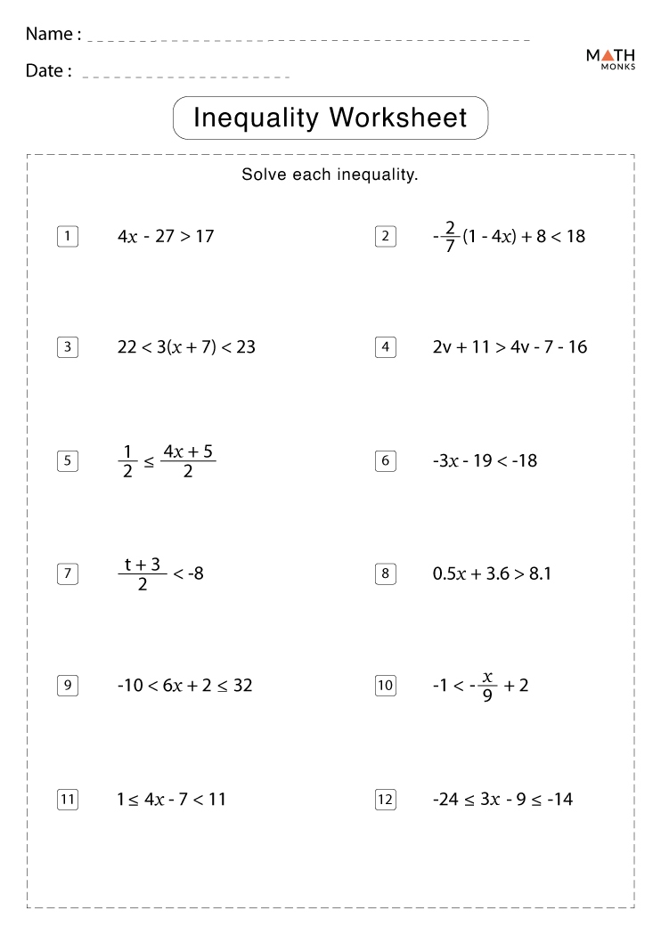 Equations with inequalities worksheets are a valuable resource for students to practice solving equations that involve inequalities. These worksheets typically include a variety of problems that require students to solve for a variable while also considering the inequality sign. This helps students develop their understanding of how to work with inequalities and apply their knowledge to real-world scenarios.