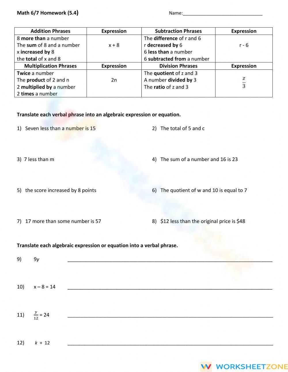 Expressions and equations worksheets can also include word problems that require students to translate verbal expressions into mathematical expressions and equations. These problems help students practice applying mathematical concepts to real-world situations and improve their critical thinking skills. By working through a variety of problems on these worksheets, students can develop a strong foundation in algebra and build confidence in their mathematical abilities.