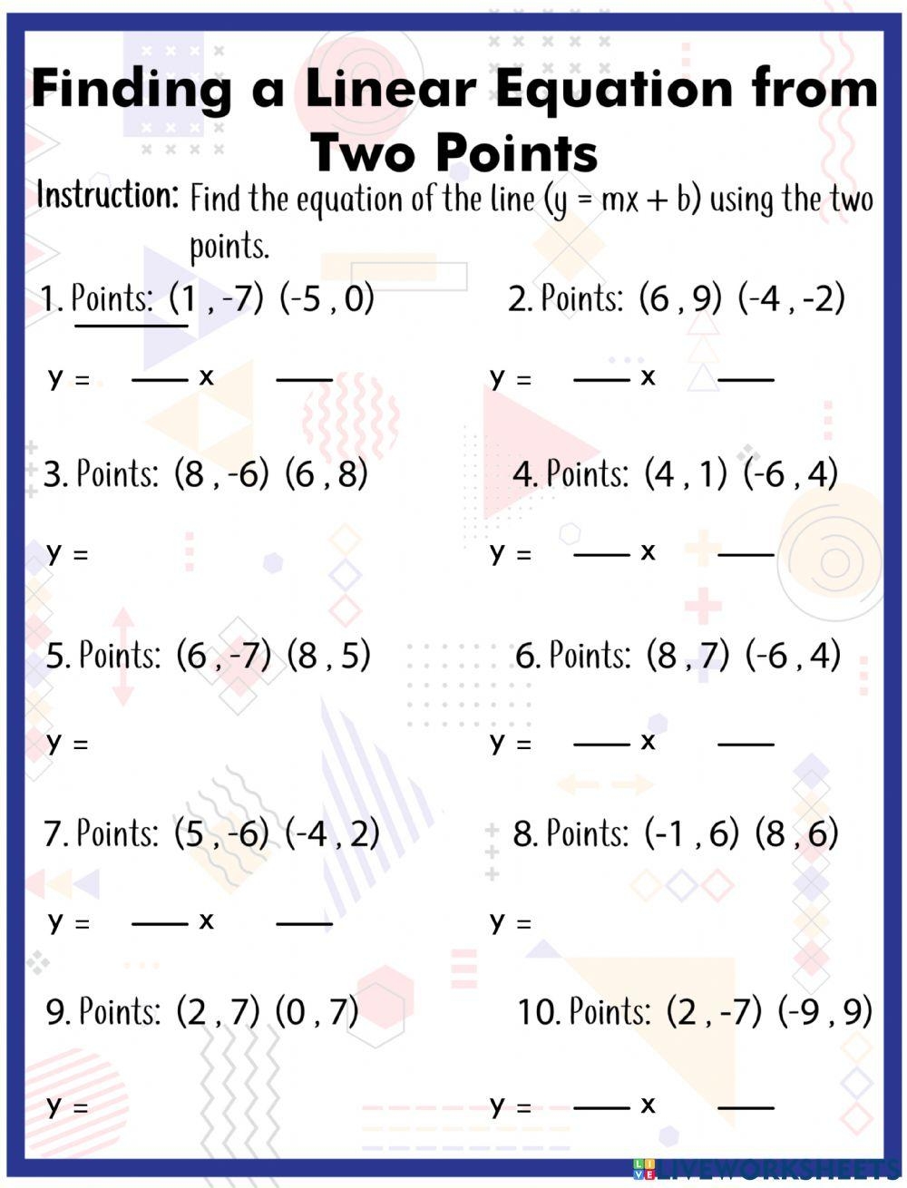 By practicing with worksheets that provide various sets of points, you can enhance your understanding of finding the equation of a line given two points. These worksheets typically include exercises where you have to calculate the slope, determine the y-intercept, and write the equation of the line. Through repetition and practice, you can master this essential algebraic skill.