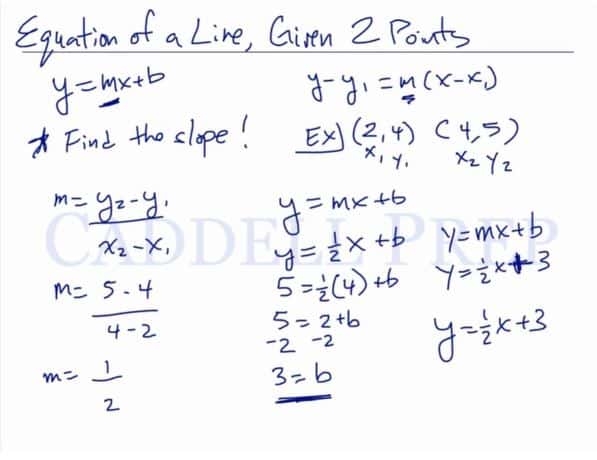 For example, suppose you have two points (3, 5) and (7, 9). To find the equation of the line passing through these points, you would first calculate the slope: m = (9 – 5) / (7 – 3) = 1. Next, you can substitute the slope into the equation y = mx + b and use one of the points to solve for the y-intercept. In this case, the equation of the line would be y = x + 2.