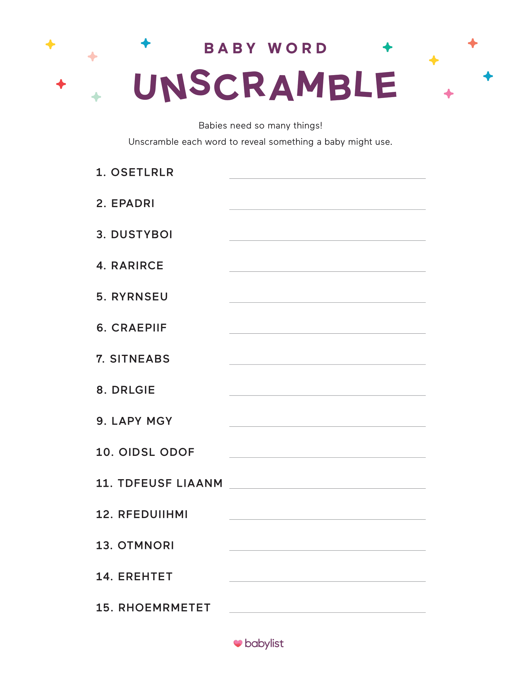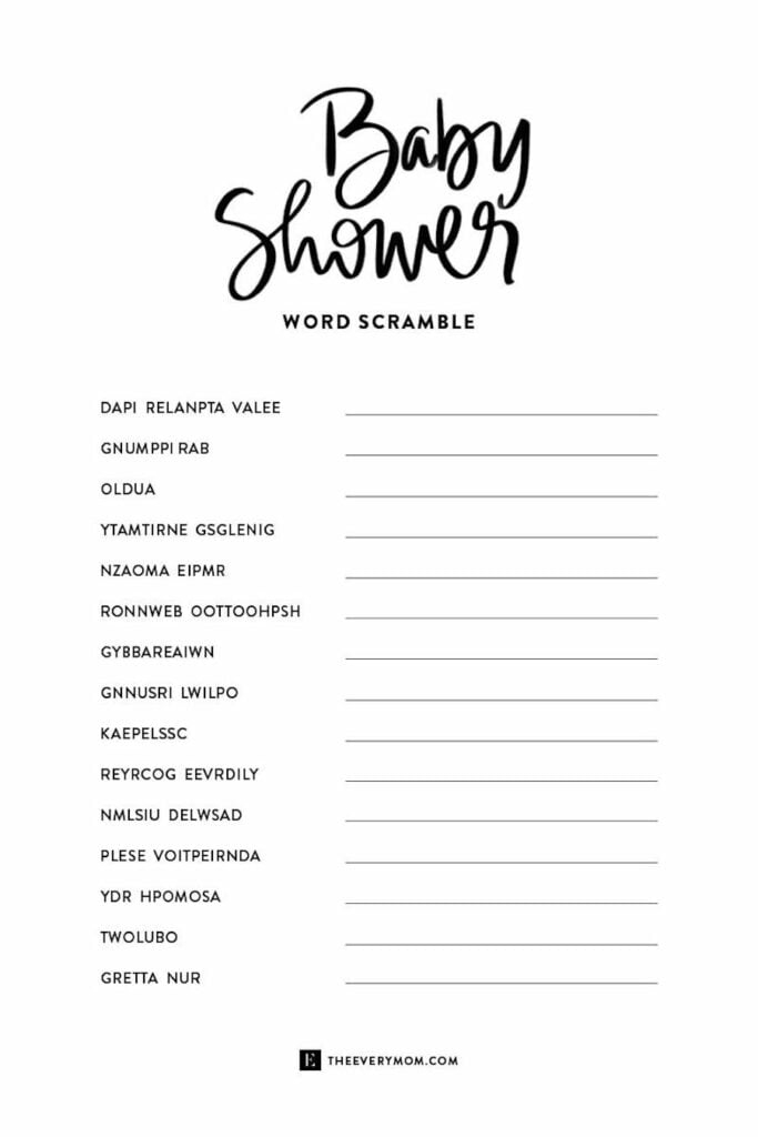 2. Baby Word Scramble: Test your guests’ knowledge of baby-related terms with this fun word scramble game. Print out scrambled words and have guests unscramble them within a certain time limit. The guest with the most correct answers wins!