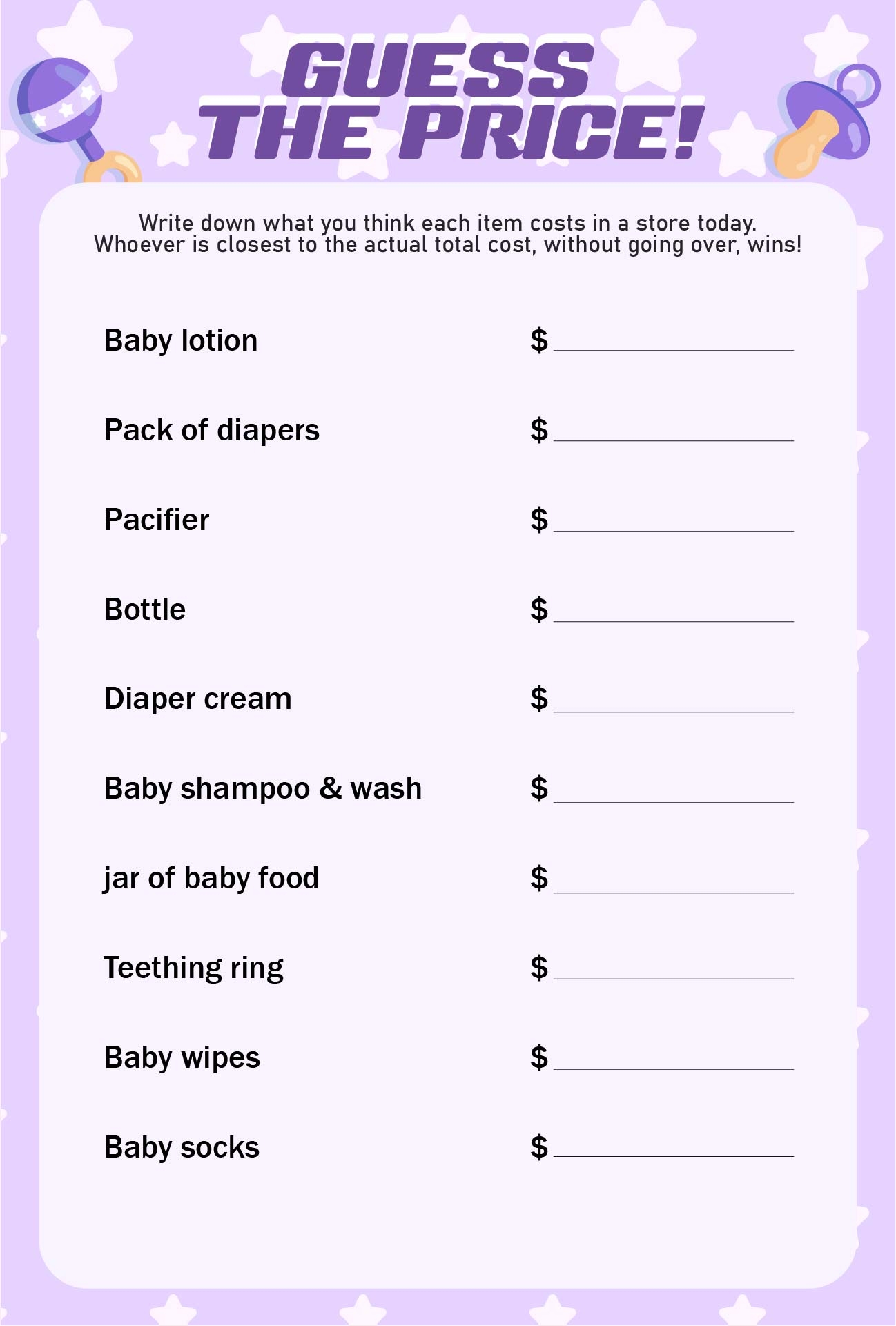 5. Baby Price is Right: Test your guests’ knowledge of baby items and their prices with this fun game. Print out a list of baby items and their prices and have guests guess the total cost. The guest closest to the actual total wins!