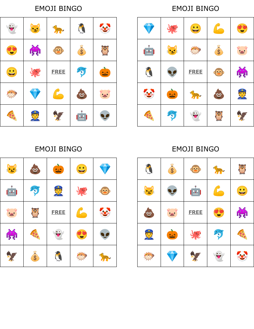 Emoji Bingo is not only entertaining but also helps improve visual recognition skills and attention to detail. Players must quickly scan their cards for the called emoji symbols and strategize to be the first to complete a winning pattern. The game can be played for a single round or multiple rounds for extended fun.