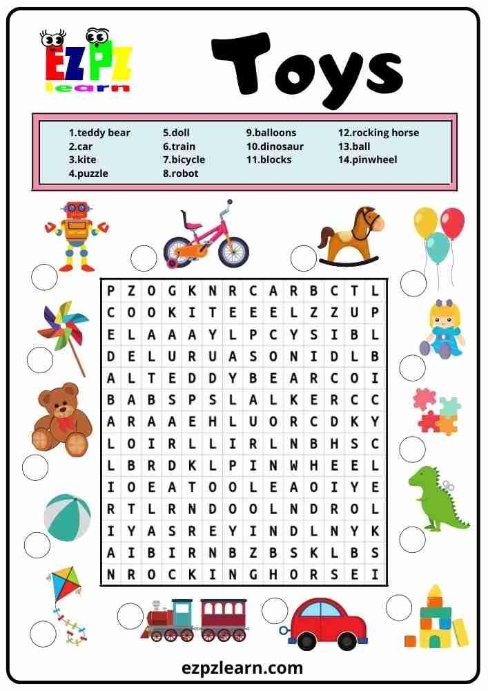 Free Printable Word Search Worksheets For Kids Topic Toys Kindergarten