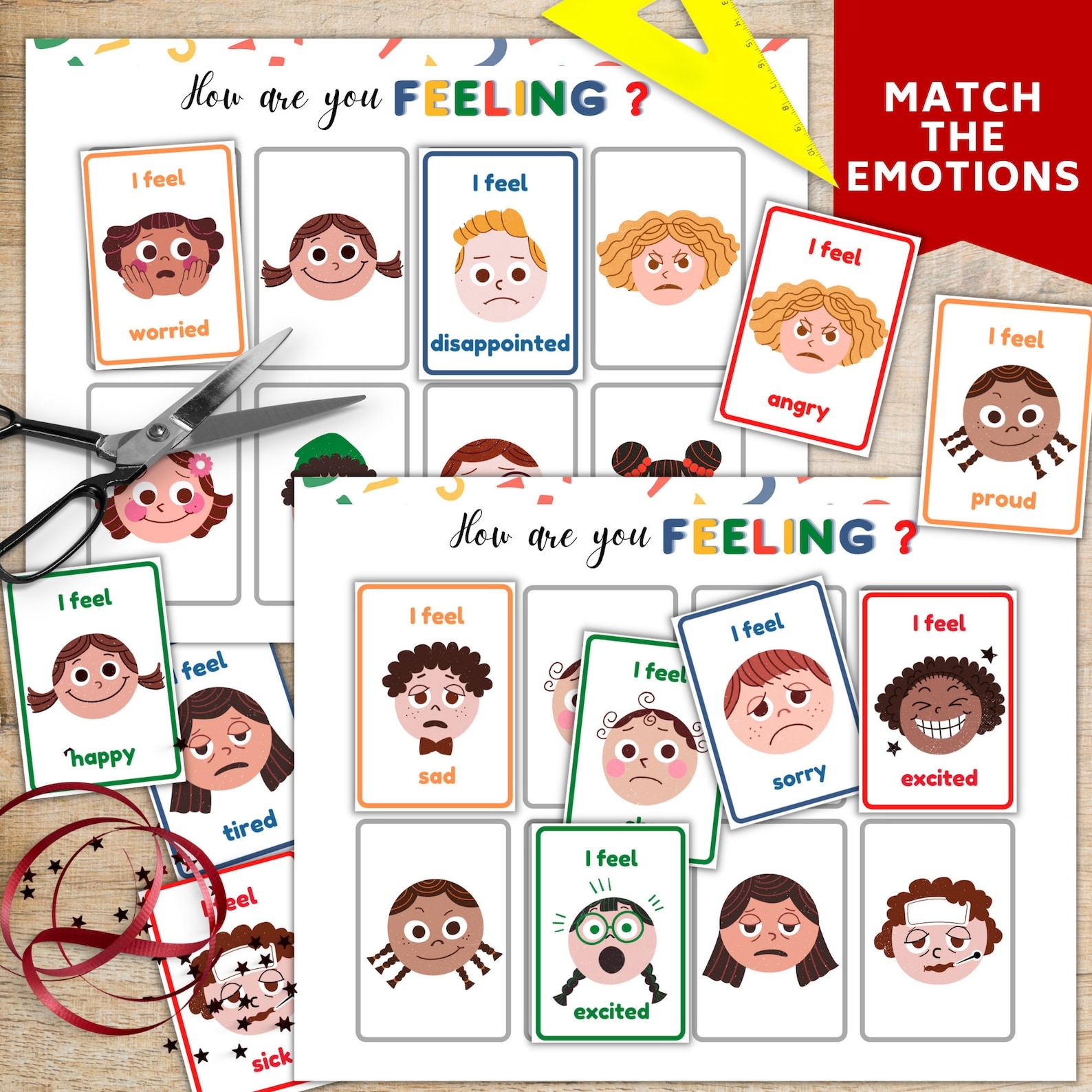 As children play the feelings matching game, encourage them to talk about times when they have felt each emotion and how they were able to cope with it. This can help children develop a better understanding of their own emotions and learn effective strategies for managing them in the future.
