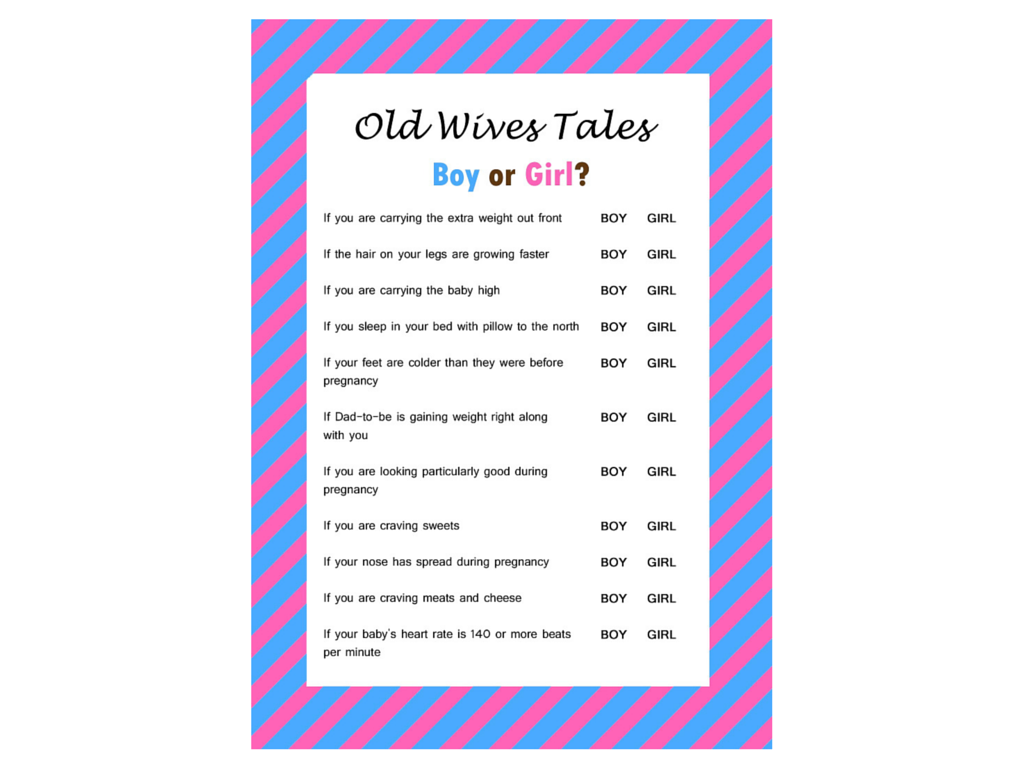 2. Old Wives’ Tales Quiz: Test your guests’ knowledge of old wives’ tales and see if they can predict the gender of the baby based on myths and superstitions. Create a printable quiz with questions like “Is the baby carrying high or low?” and “Are you craving sweet or salty foods?” It’s a fun way to see who believes in these age-old predictions!