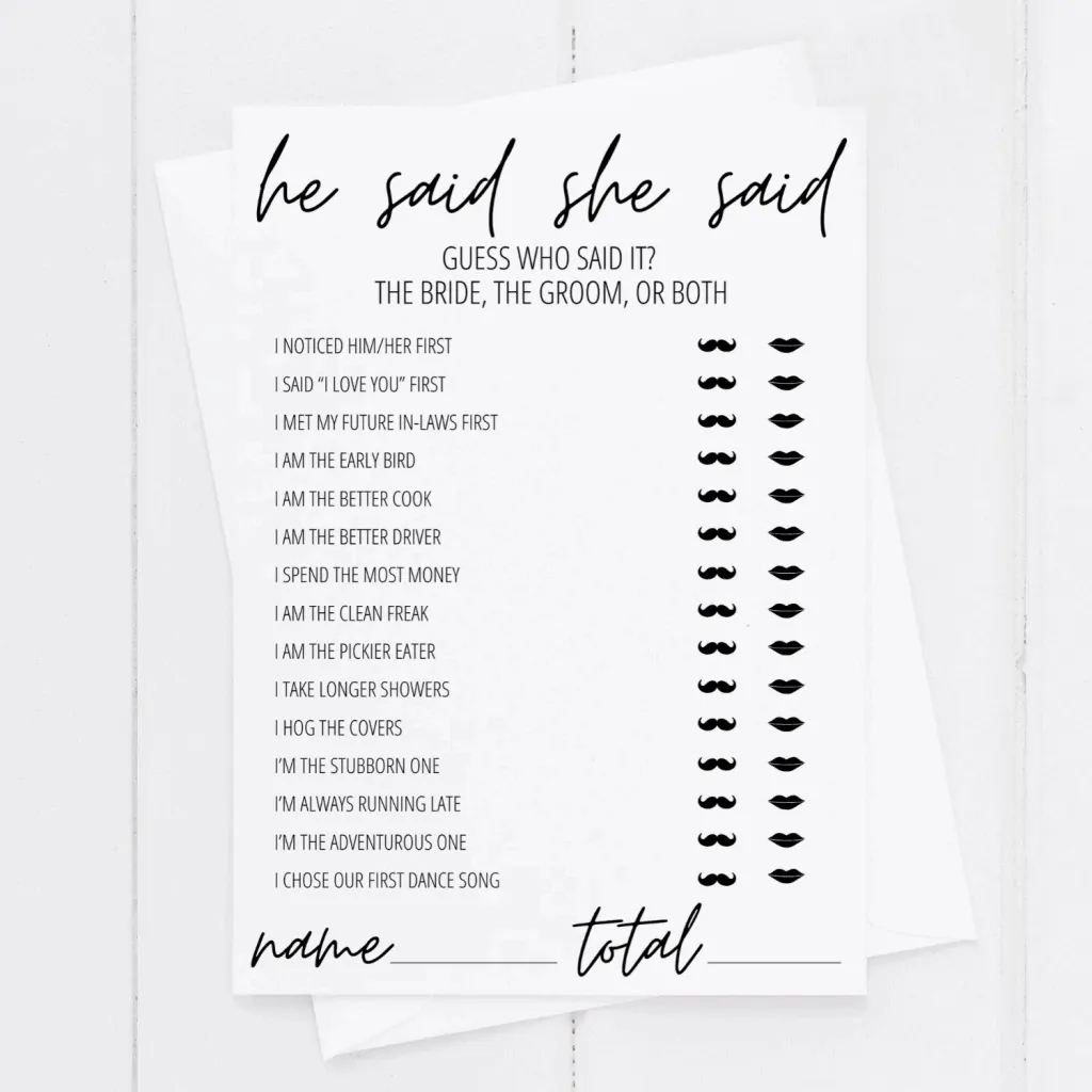 He Said She Said game is a classic party game that involves guessing who said certain statements – the bride or the groom, or any other couple you choose. It’s a hilarious and interactive way to get to know the couple better and have a few laughs along the way.