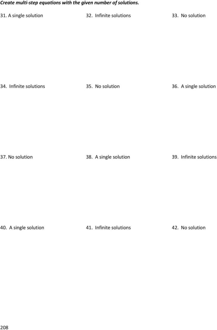 One way to practice solving infinite and no solution equations is through worksheets specifically designed to test your understanding of these concepts. These worksheets typically present you with a series of equations and ask you to determine whether they have infinite solutions, no solutions, or a unique solution.