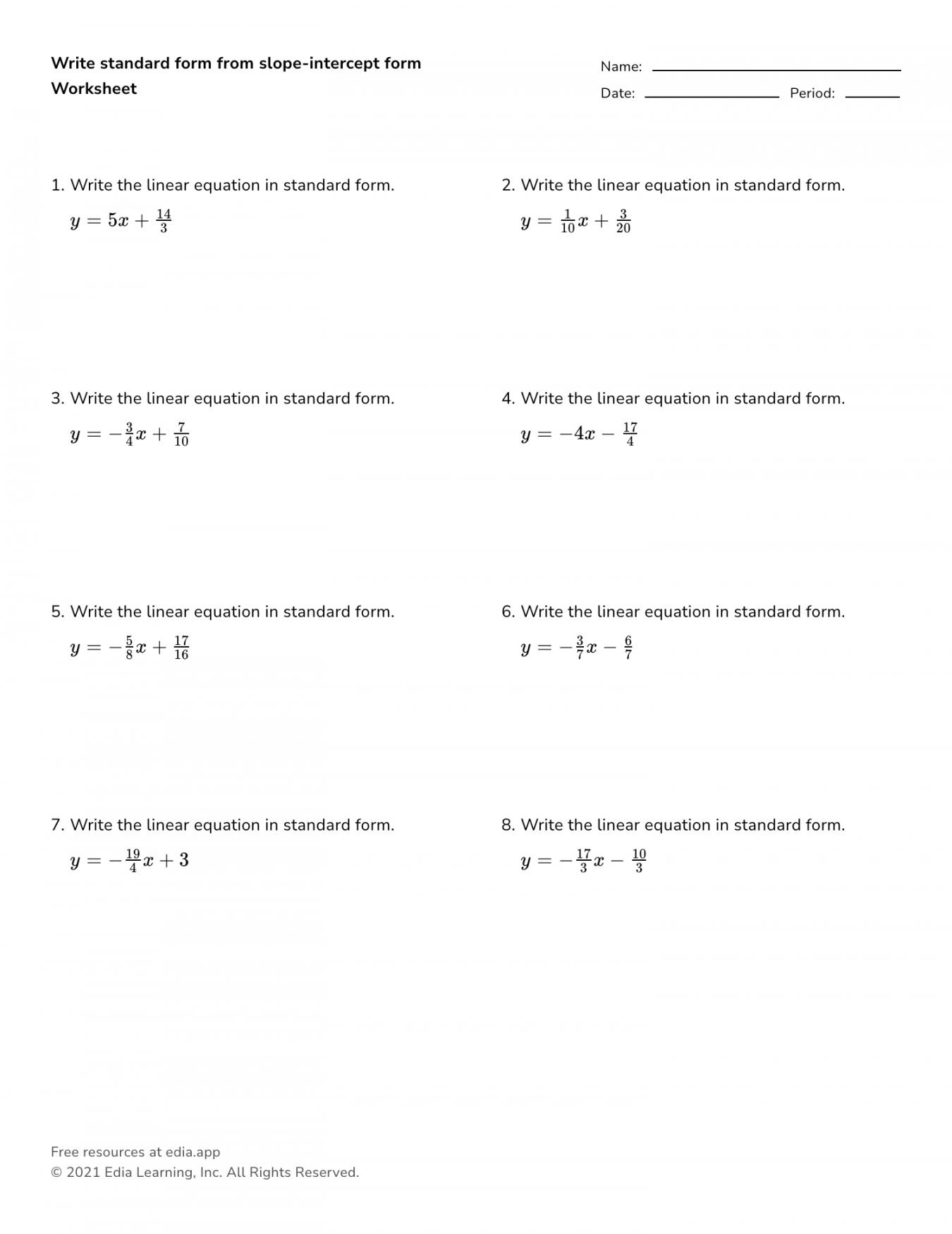 In addition to honing their math skills, working on linear equations standard form worksheets can also improve students’ organizational and time management abilities. By completing multiple exercises within a given time frame, students learn to prioritize tasks, stay focused, and manage their time effectively. These skills are transferable to other subjects and real-world situations, making worksheet practice a valuable learning tool.