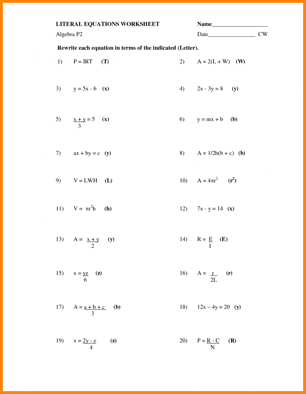 Literal equations can be a challenging topic for students to grasp, as they involve multiple variables and equations that need to be manipulated to solve for a specific variable. One way to help students practice and improve their skills in solving literal equations is through the use of practice worksheets. These worksheets provide students with the opportunity to work through various problems and equations, allowing them to strengthen their understanding of the concepts involved.