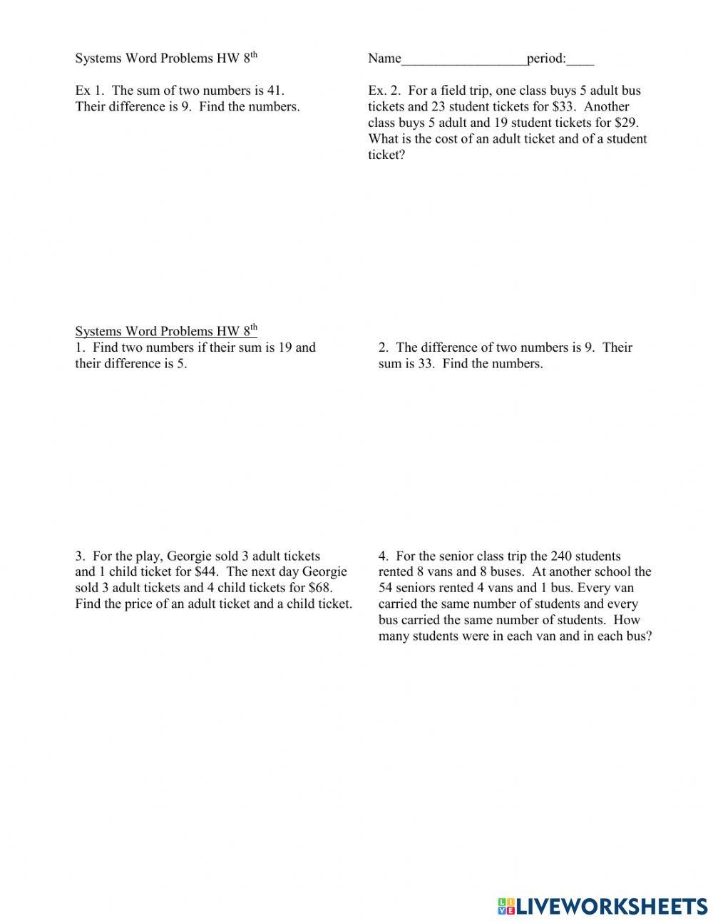 Word problems can be challenging for students, as they require the ability to translate a written scenario into mathematical equations. One effective way to practice this skill is by using worksheets that provide various word problems for students to solve. By working through these problems, students can improve their ability to create equations and solve them accurately.