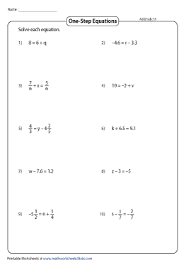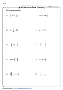 Adding And Subtracting One Step Equations With Fractions Worksheet