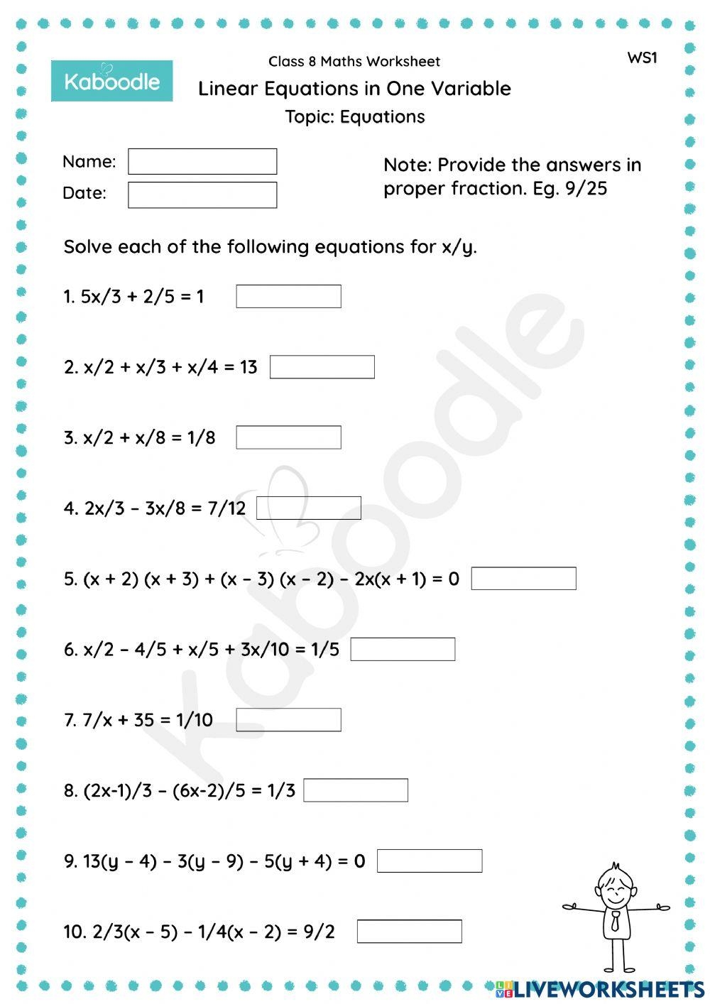 A one variable linear equations worksheet typically contains a series of equations for students to solve. These equations may vary in difficulty, ranging from simple equations with whole number solutions to more complex equations involving fractions or decimals. By working through these worksheets, students can improve their problem-solving skills and gain confidence in solving one variable linear equations.