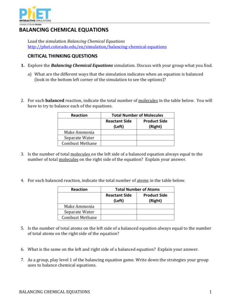 Chemical equations are important in understanding the reactions that take place in chemistry. Balancing these equations is a crucial skill that every student must learn. The PhET Balancing Chemical Equations Worksheet provides a hands-on approach to mastering this skill, with interactive simulations that make the learning process engaging and fun.