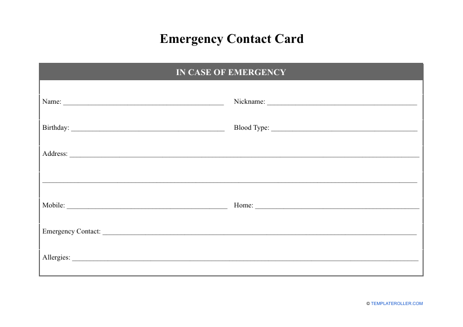 If you’re looking for a convenient and free way to create your own emergency contact card, there are many templates available online. These templates are easy to use and can be customized to include all the necessary information. Simply fill in the blanks with your details, print the card, and keep it in a safe place where it can be easily accessed in case of an emergency.