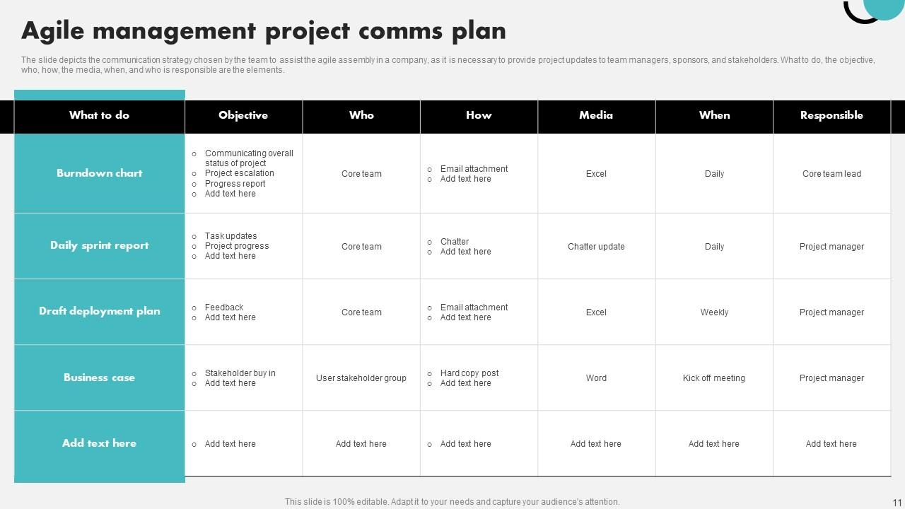- Communication Channels: Identify the communication channels that will be used to deliver messages, such as email, meetings, newsletters, or project management tools.