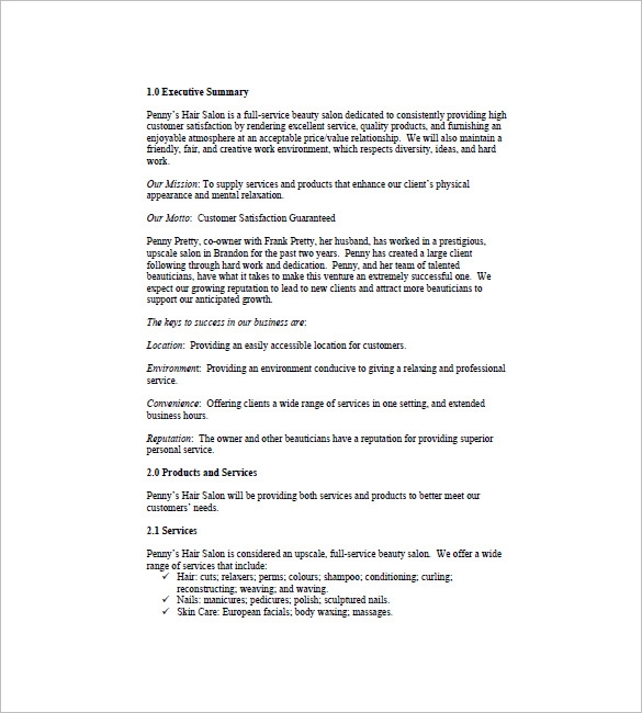 1. Executive Summary: This section should provide an overview of your salon business, including your mission statement, target market, and competitive analysis. It should also outline your business goals and objectives.
