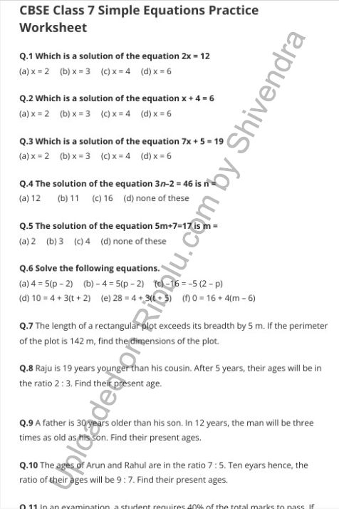 Simple Equations Worksheets For Class 7 Maths
