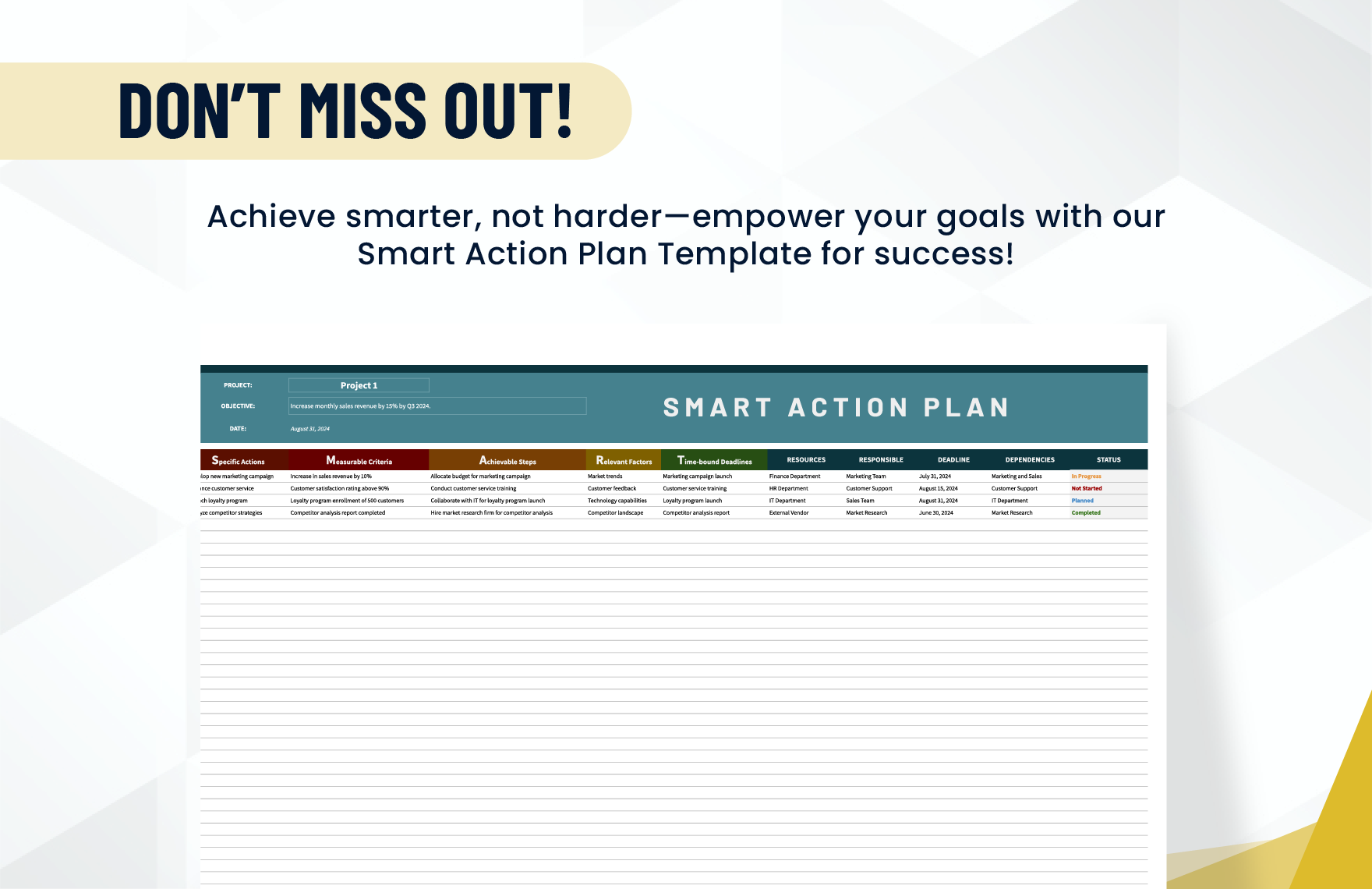 Setting goals is an important step in achieving success, but without a clear plan of action, those goals may just remain dreams. A smart action plan template can help you outline specific steps to take in order to reach your objectives.