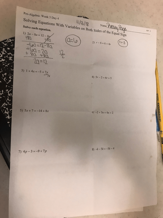 Algebra 1 Solving Equations With Variables On Both Sides Worksheets