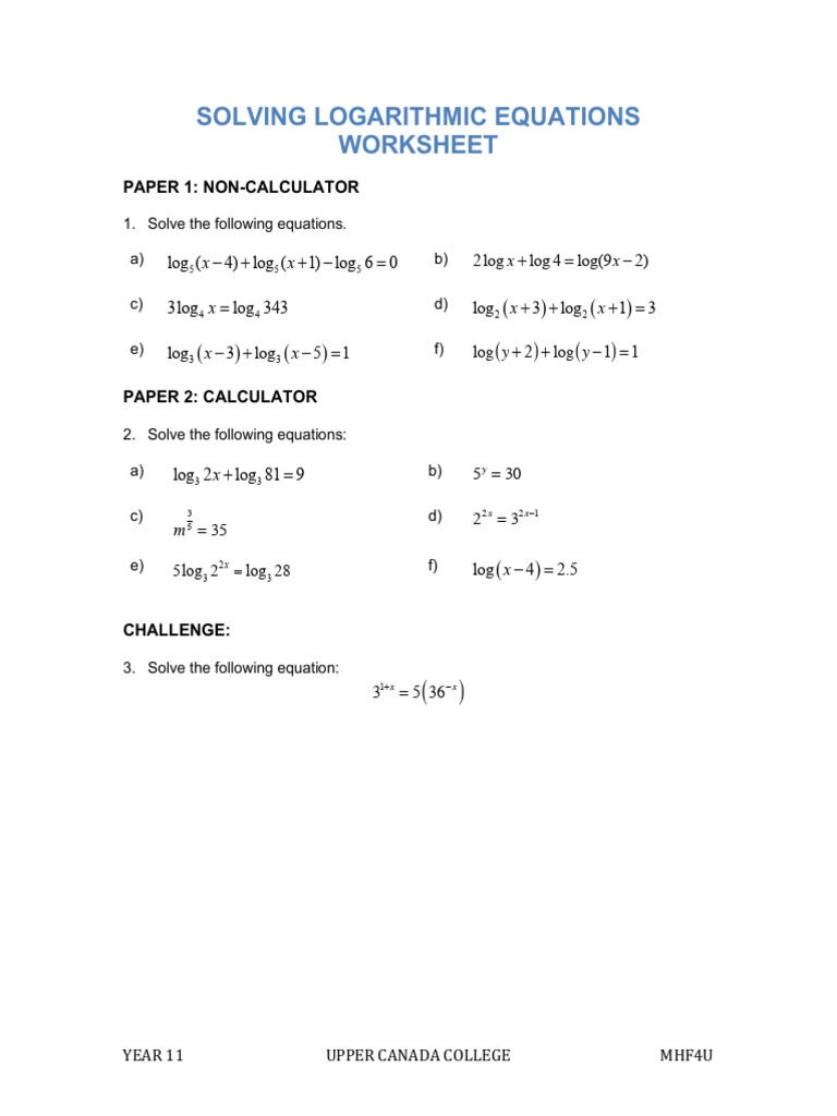 Solving Logarithmic Equations Worksheet with Answers PDF