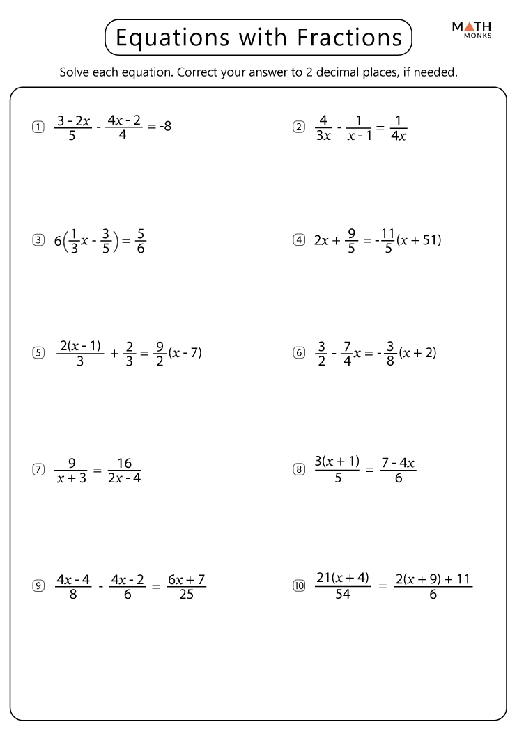 Students may encounter equations with variables on both sides, fractions, or decimals in multistep equations worksheets. These variations provide opportunities for students to apply different techniques, such as clearing fractions or distributing terms, to simplify the equations. By exposing students to a diverse range of equations, worksheets help them develop a versatile problem-solving approach.