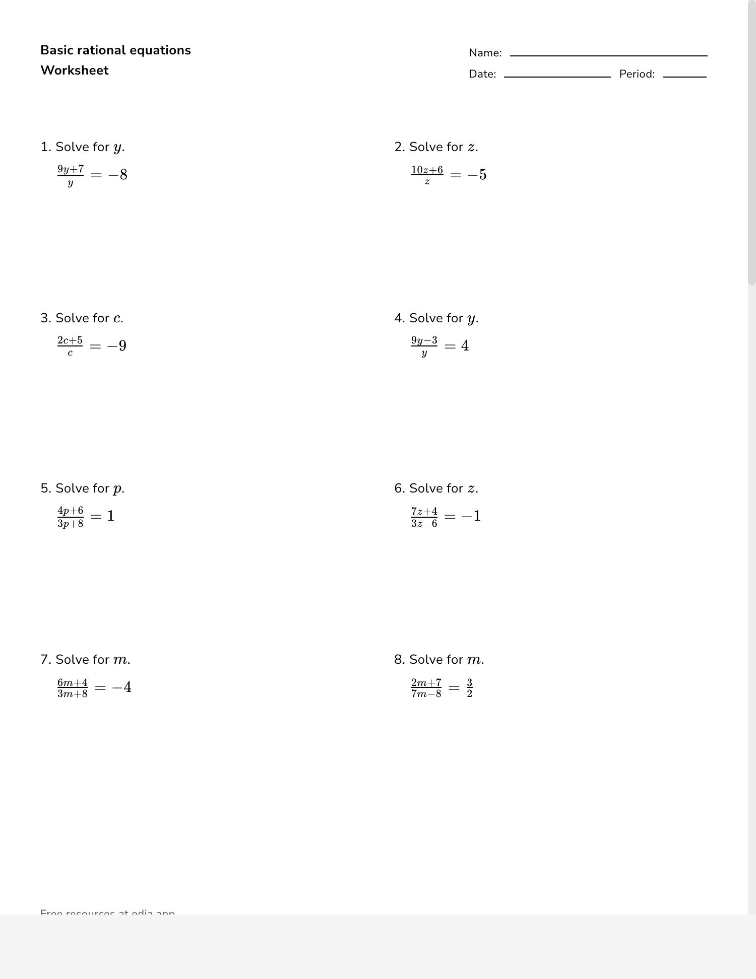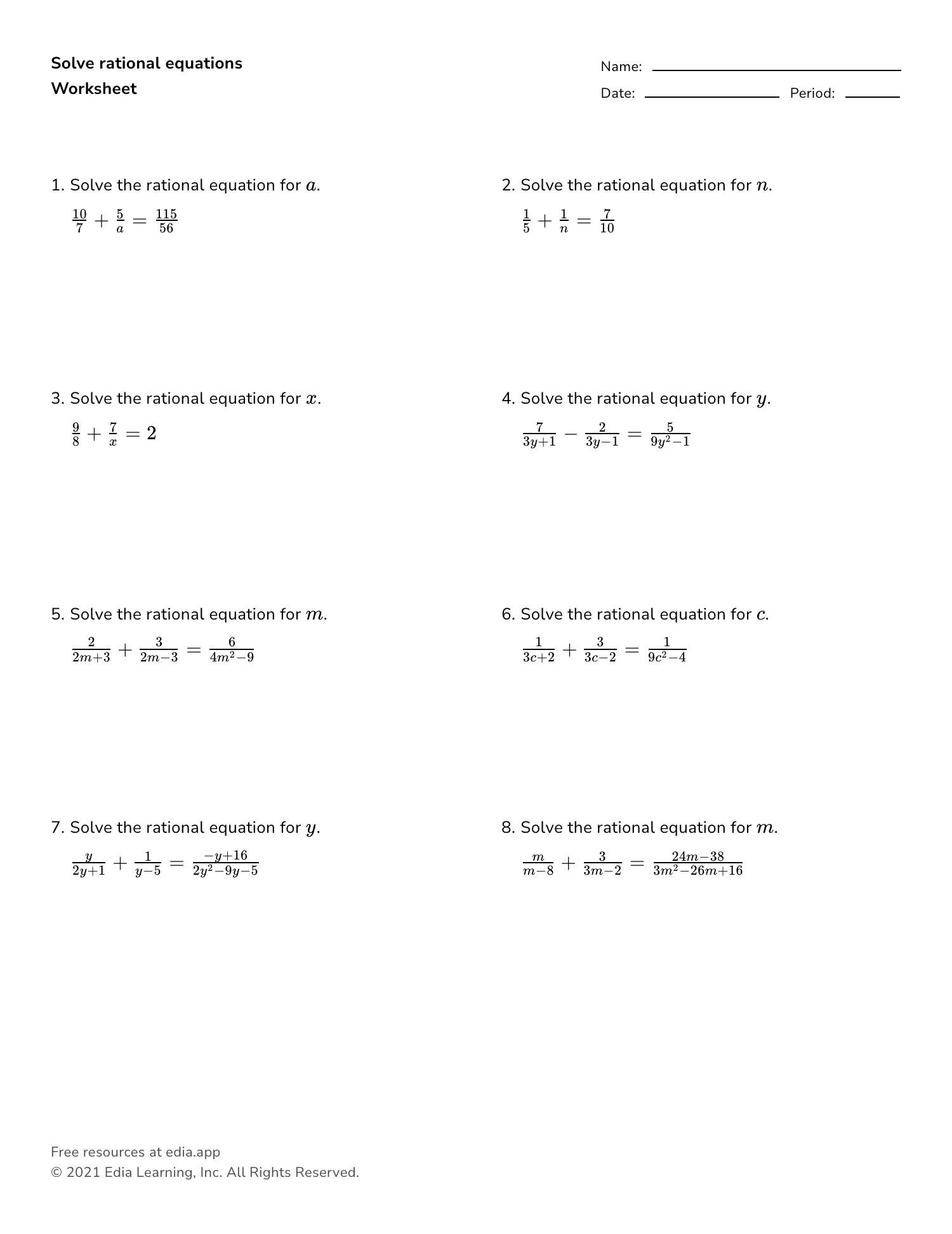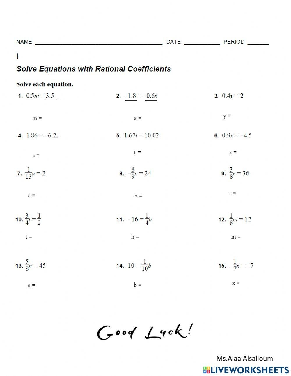 When working on a rational equations worksheet, it’s important to follow a systematic approach. Start by identifying the variables and any restrictions on the domain of the equation. Next, simplify the equation by clearing out any fractions or simplifying expressions. Then, solve for the variable by isolating it on one side of the equation. Finally, check your solution by plugging it back into the original equation to ensure it satisfies all conditions.
