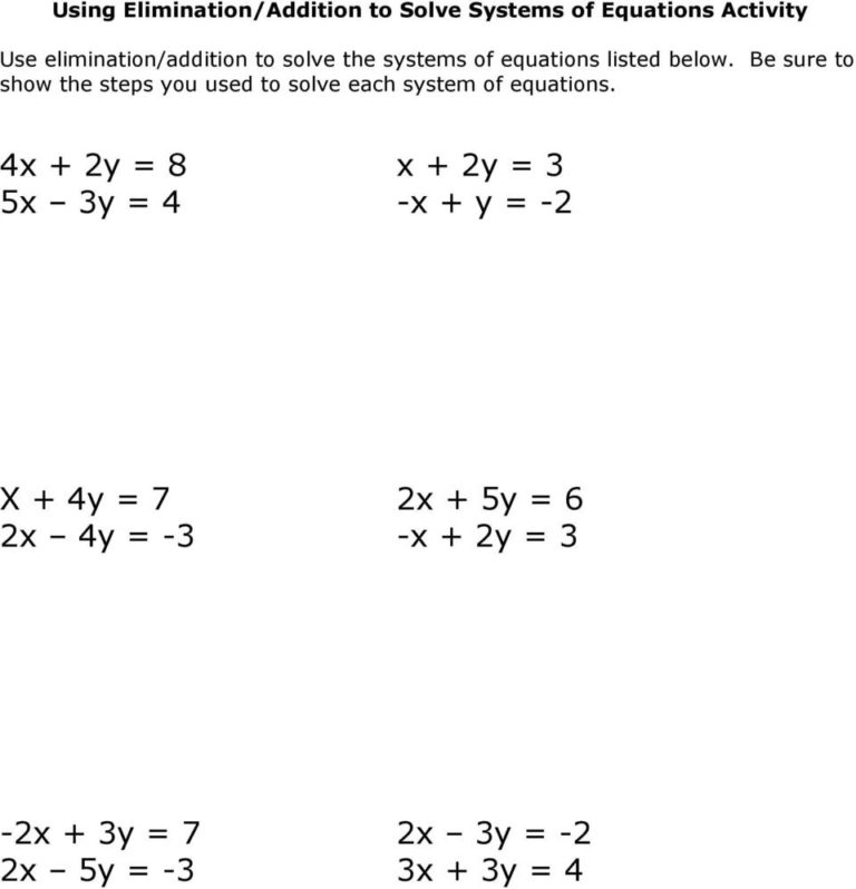 One common way to practice and reinforce your understanding of solving systems of equations by elimination is through worksheets. These worksheets typically contain a series of equations that need to be solved using the elimination method. They provide students with the opportunity to practice their skills and improve their problem-solving abilities.