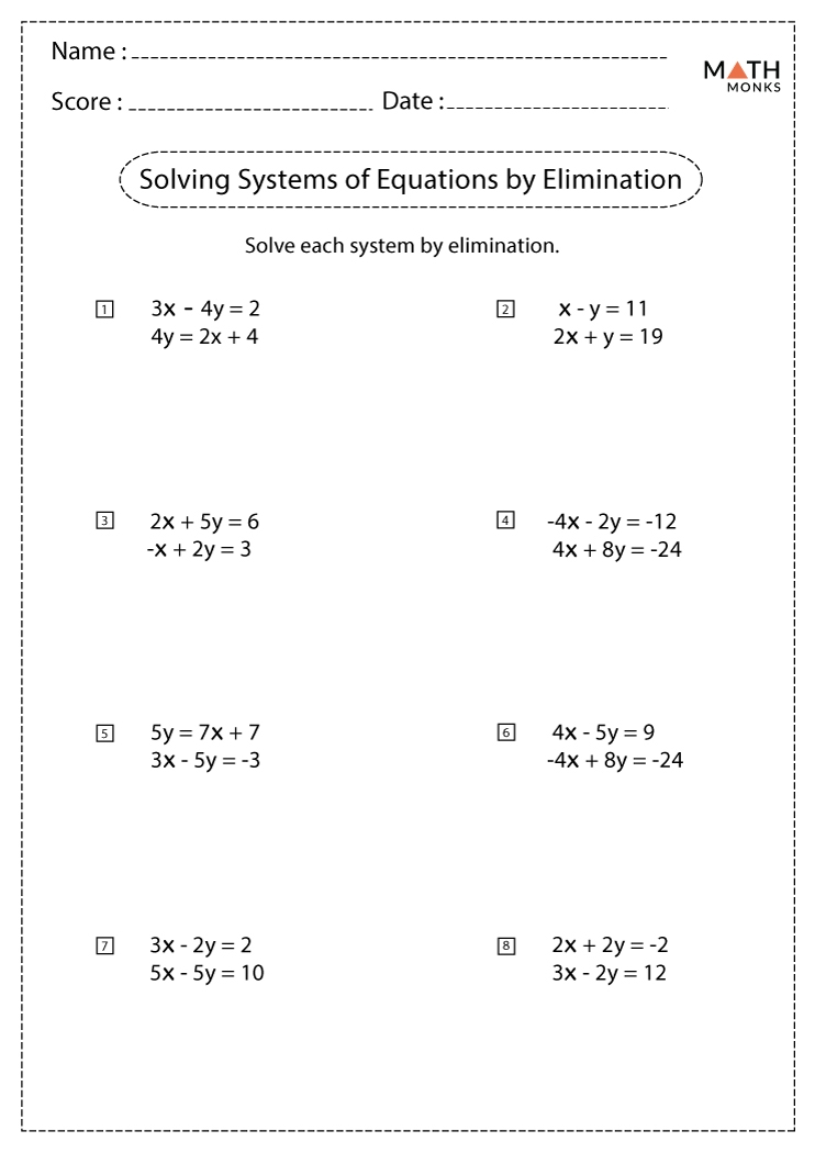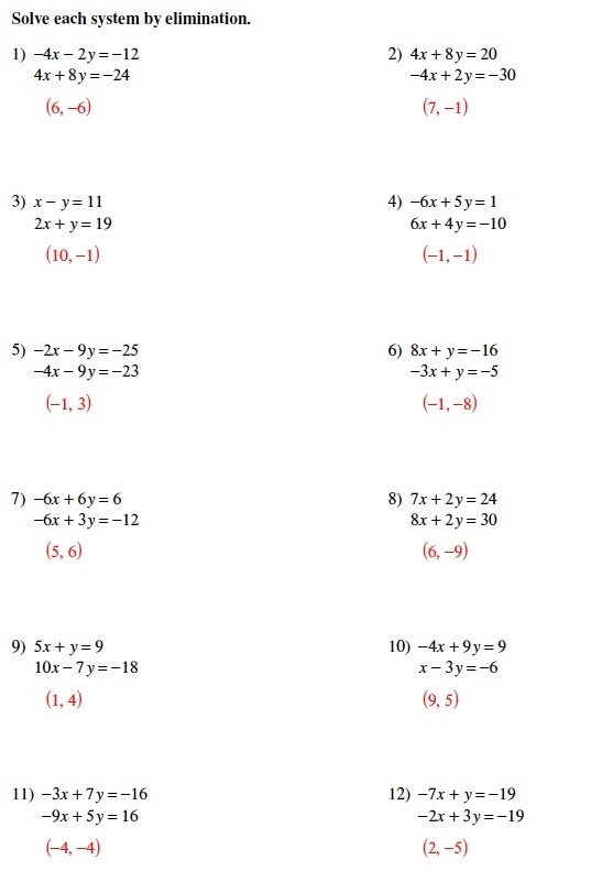 When it comes to solving systems of equations, the elimination method is a popular choice among students. This method involves adding or subtracting the equations in order to eliminate one of the variables and solve for the other. Worksheets that focus on solving systems of equations by elimination can help students practice and master this important algebraic skill.