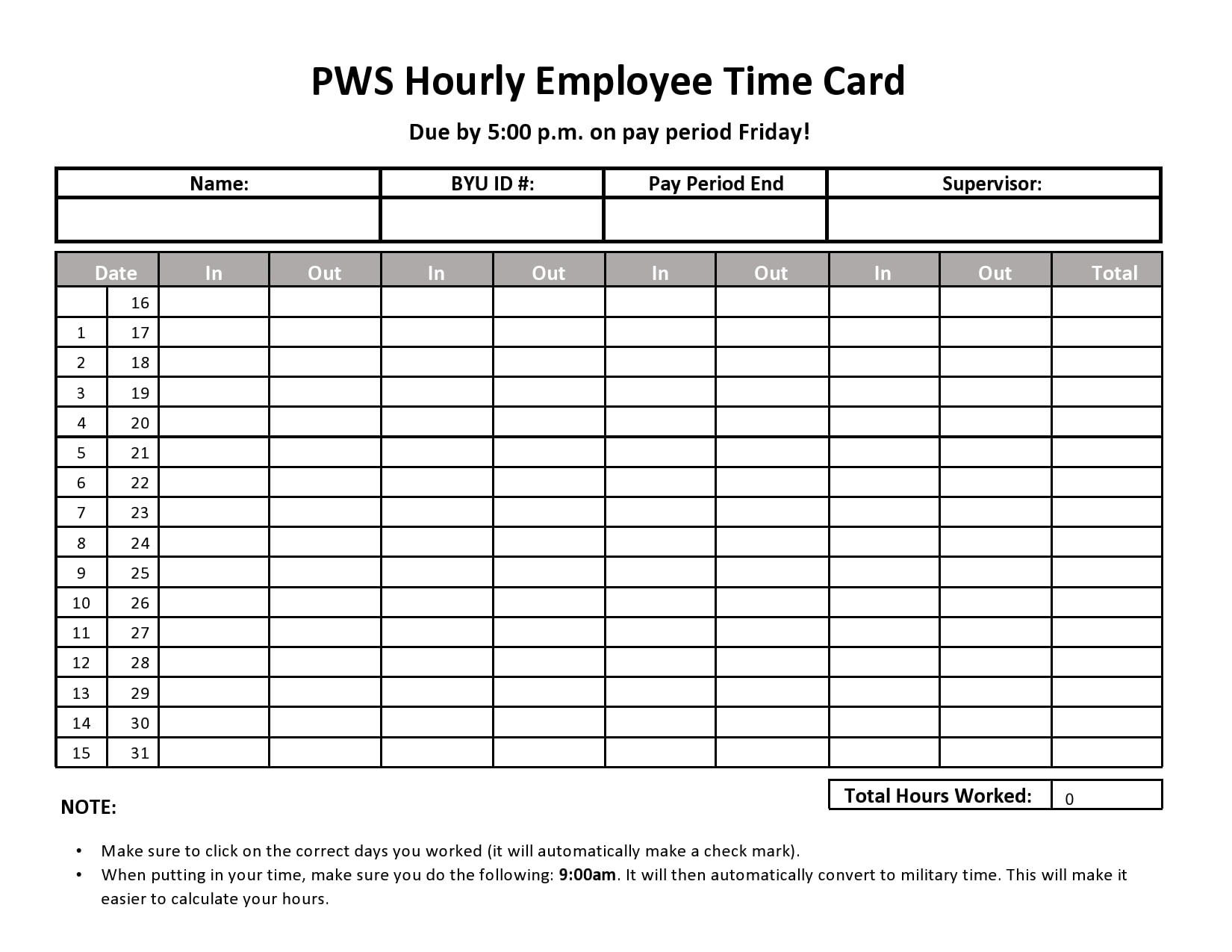 There are various time card templates available for free online, ranging from simple weekly timesheets to more detailed bi-weekly or monthly formats. These templates typically include sections for employee information, dates, hours worked, and total hours. Some templates also feature categories for different types of work hours, such as regular time, overtime, and vacation time.