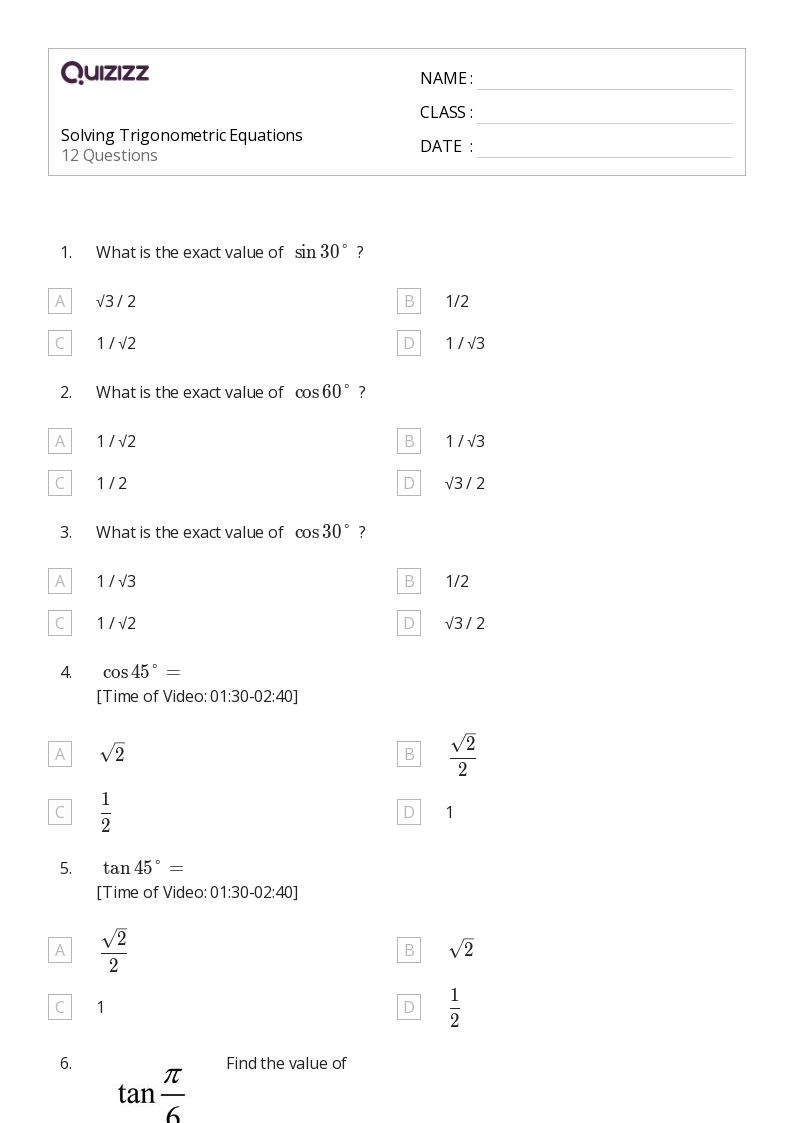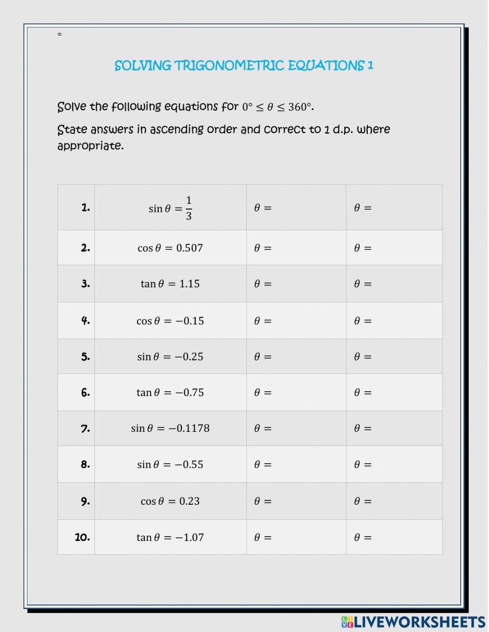 Trigonometric equations can be challenging for students to solve, as they involve the use of trigonometric functions such as sine, cosine, and tangent. A trigonometric equations worksheet is a helpful tool for students to practice solving these types of equations and improve their understanding of trigonometry concepts.