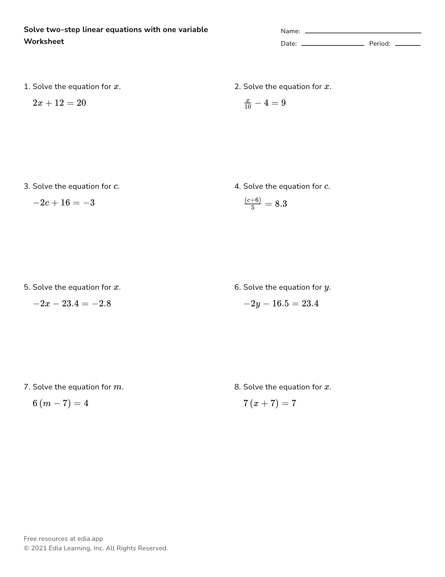 Linear equations are fundamental in algebra and are often used to solve real-world problems. Two-step linear equations involve two operations that need to be performed to isolate the variable and solve for its value. A worksheet on two-step linear equations is a great way for students to practice and reinforce their understanding of this concept.