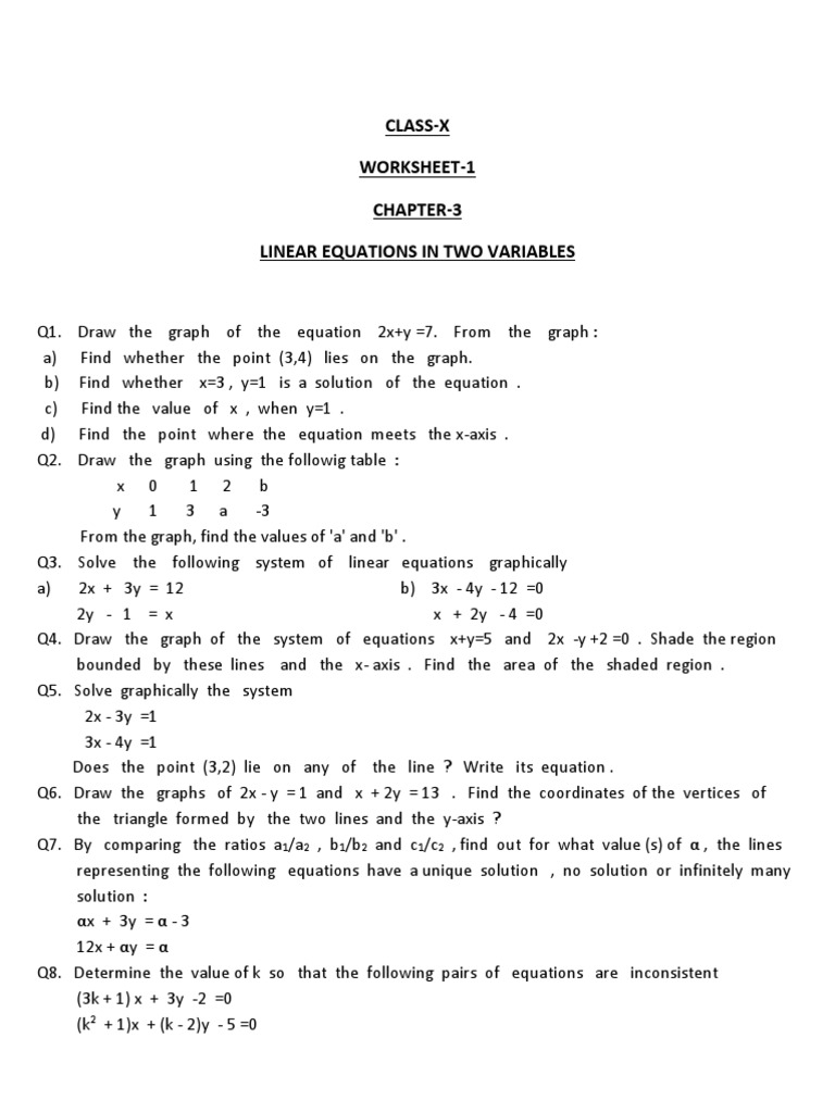 One common type of problem you might encounter on a two variable linear equations worksheet is the task of finding the values of x and y that satisfy a given equation. These problems often involve substituting known values into the equation and then solving for the unknown variables using algebraic techniques such as elimination or substitution.
