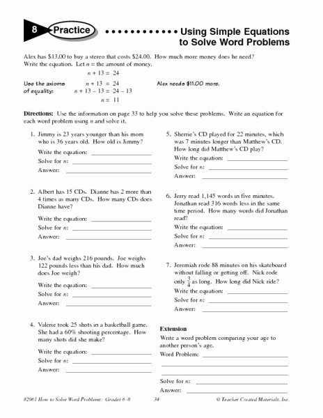 Using Equations to Solve Word Problems Worksheet Answer Key