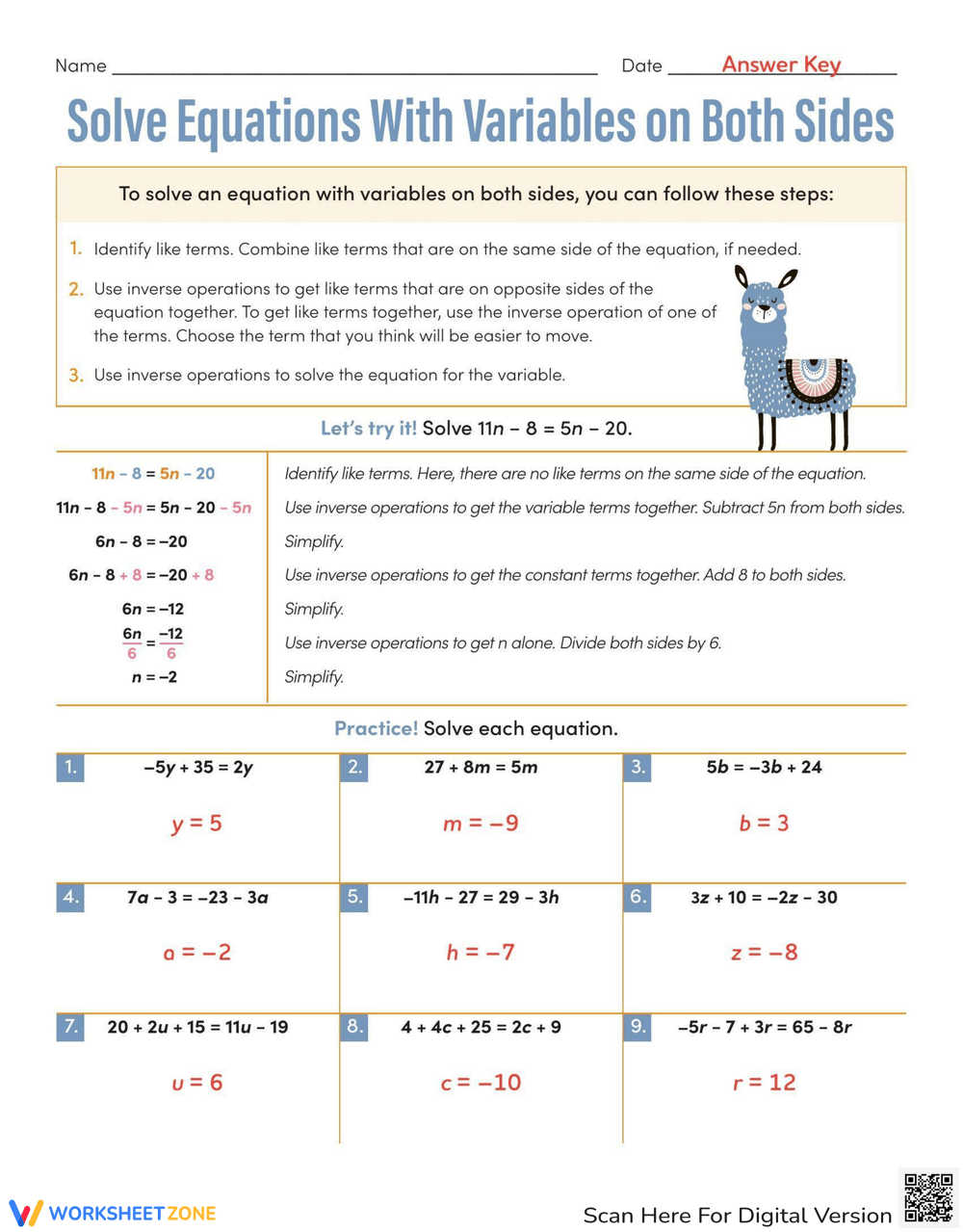 Solve Equations With Variables On Both Sides Worksheet Worksheets Library