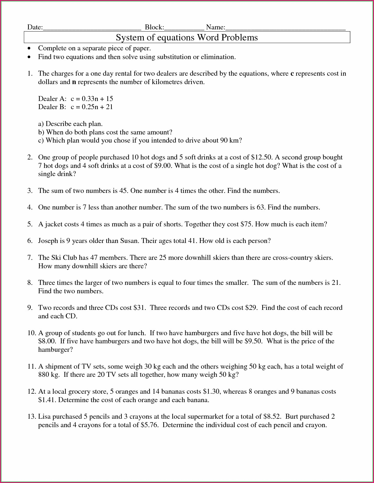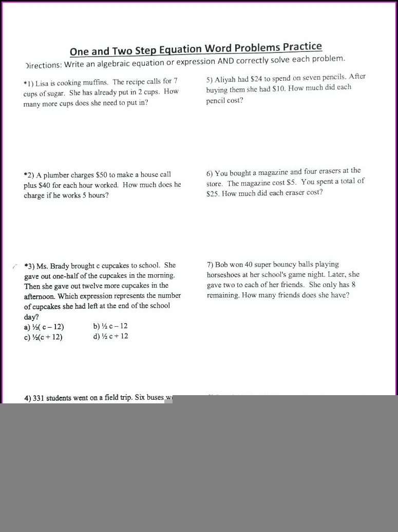 Word Problems for Linear Equations Worksheet