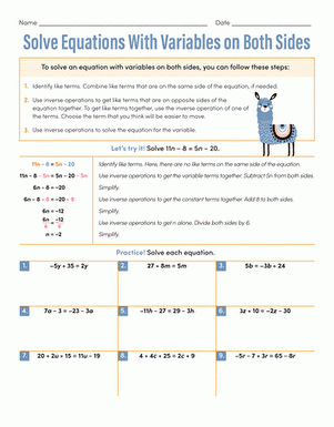 When working on a worksheet that includes equations with variables on both sides, students should first identify the variables present in the equation. They should then use properties of equality to simplify the equation and isolate the variable on one side. This may involve combining like terms, distributing, or using inverse operations to move terms to one side of the equation.