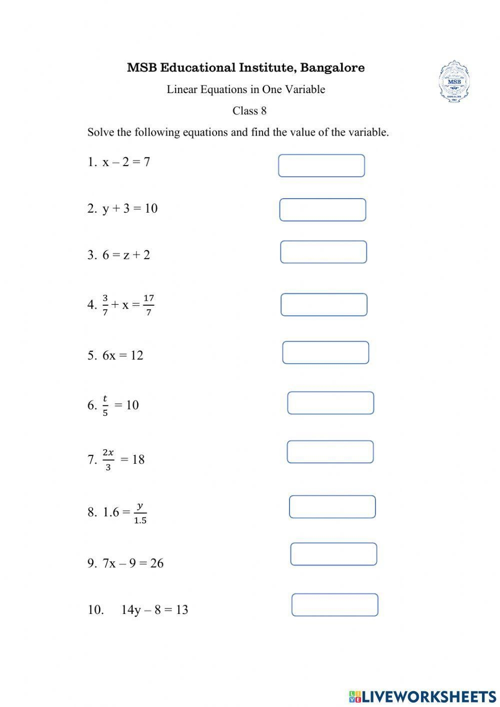 By regularly completing worksheets on linear equations in one variable, students can improve their algebraic skills, enhance their problem-solving abilities, and gain a deeper understanding of mathematical concepts. These worksheets provide valuable practice opportunities that reinforce classroom learning and help students excel in algebra courses.